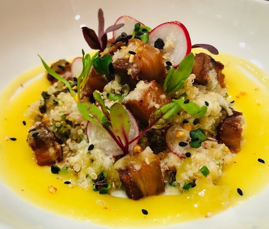 Ensalada templada de quinoa con panceta de cochinillo y coulis de piña